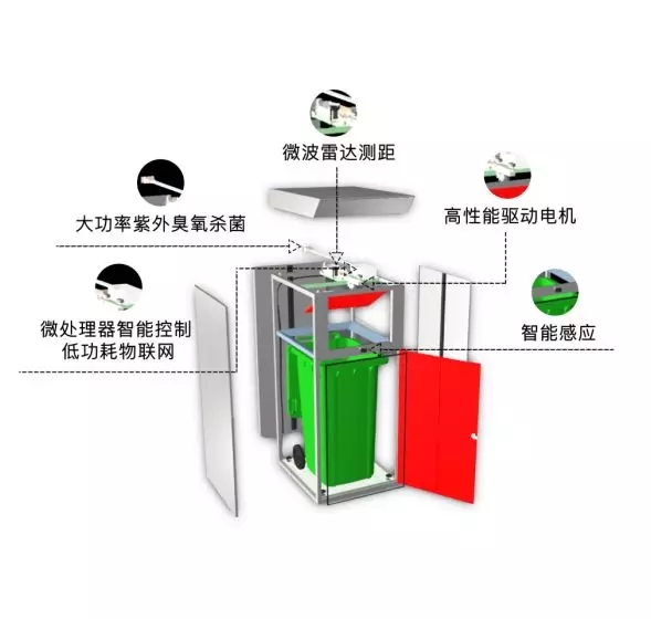 主要功能:紫外線臭氧雙重實(shí)時(shí)消毒、感應(yīng)開門、溢滿預(yù)警、箱體傾倒預(yù)警、高溫預(yù)警、清運(yùn)時(shí)效性預(yù)警、投遞次數(shù)統(tǒng)計(jì)、投遞量統(tǒng)計(jì)、清運(yùn)路線規(guī)劃。
